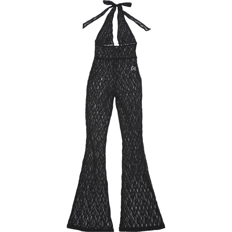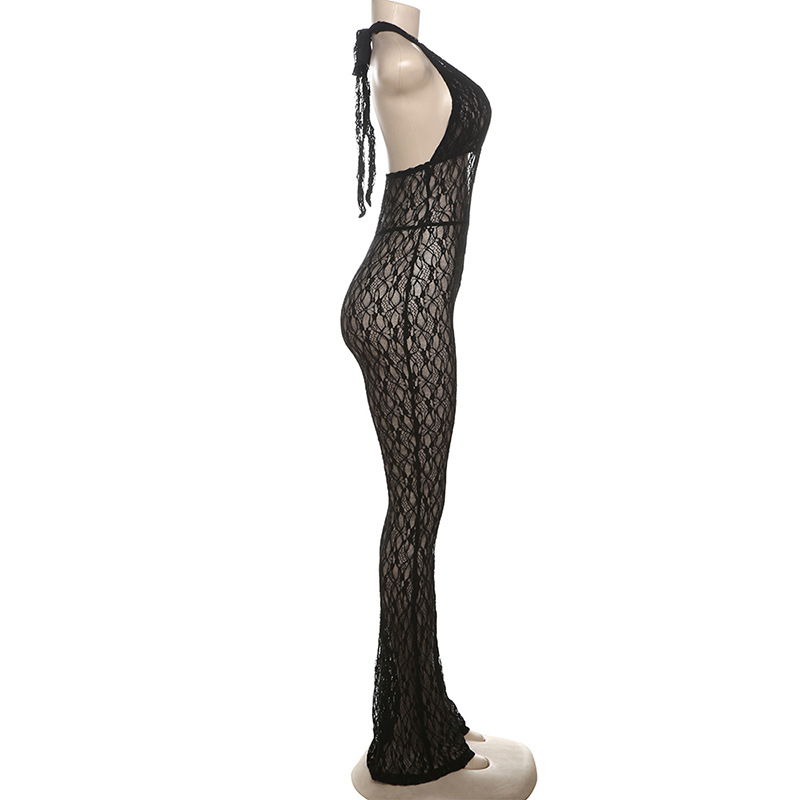Halter Deep V-neck See-through Lace Lace-up Backless Jumpsuit